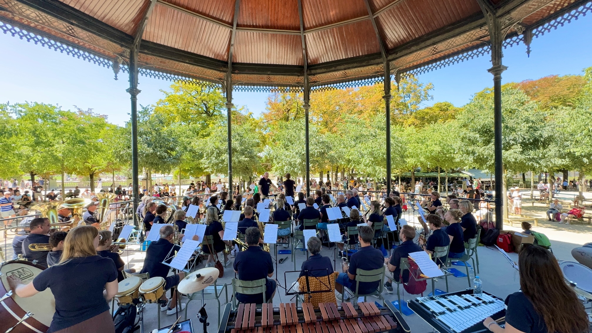 In de namiddag stond het tweede concert van de reis op het programma. De setting kon bijna niet mooier: de kiosk in de prachtige Jardin de Luxembourg, de tuin van de Franse senaat. Vooral de nummers van Franse componisten brachten de toehoorders in vervoering en deden ze enthousiast meeklappen.