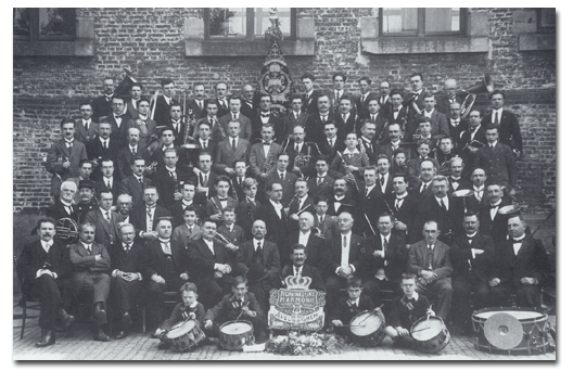 De eerste wereldoorlog legde de activiteiten van 'De Verenigde Vrienden' volledig stil. Pas in 1919 kon men 'het muziek' heropstarten. Alfons Vergracht volgde toen zijn oude en zieke oom Kamiel Vergracht op als dirigent. In december 1920 nam het korps voor het eerst zijn intrede in het huidige repetitielokaal, in die tijd de zaal van de Xaverianen genoemd. Eveneens in de jaren twintig valt de overstap te situeren van fanfare naar harmonie door de toevoeging van houtblazers (klarinet, hobo, fluit) aan de bezetting. In 1925 kreeg men de toestemming om de naam 'Koninklijke' in het vaandel te voeren. In dat jaar werd ook onderstaande groepsfoto genomen.